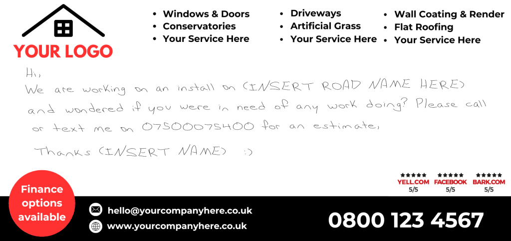 Ask us how we managed to get £68,700 for a Double Glazing Company from 5000 drops! Contact info@penwrittenpost.co.uk or Whatsapp us on 07594151481 if you have any questions on how this can help your business make the most of its installations as a sales tool.