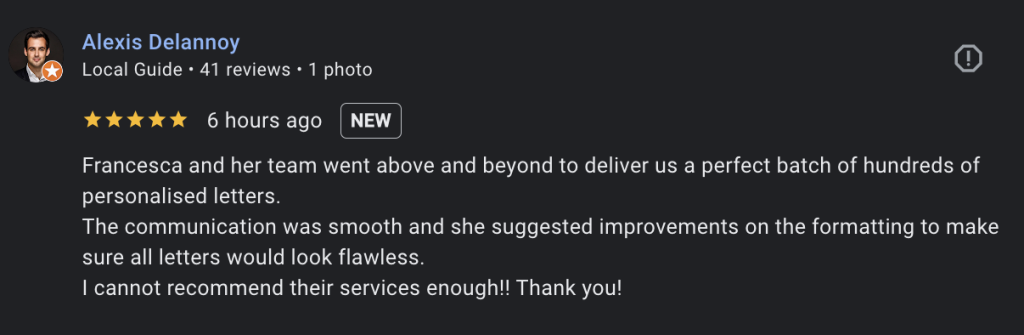 ‘Francesca and her team went above and beyond to deliver us a perfect batch of hundreds of personalised letters.