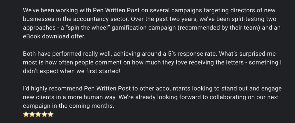 I’d highly recommend Pen Written Post to other accountants looking to stand out and engage new clients in a more human way. We’re already looking forward to collaborating on our next campaign in the coming months.
