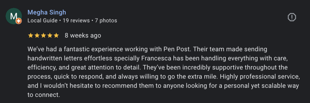We’ve had a fantastic experience working with Pen Post. Their team made sending handwritten letters effortless specially Francesca has been handling everything with care, efficiency, and great attention to detail. They’ve been incredibly supportive throughout the process, quick to respond, and always willing to go the extra mile. Highly professional service, and I wouldn’t hesitate to recommend them to anyone looking for a personal yet scalable way to connect.