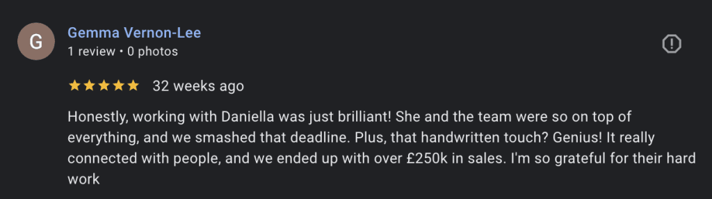 Honestly, working with Daniella was just brilliant! She and the team were so on top of everything, and we smashed that deadline. Plus, that handwritten touch? Genius! It really connected with people, and we ended up with over £250k in sales. I’m so grateful for their hard work