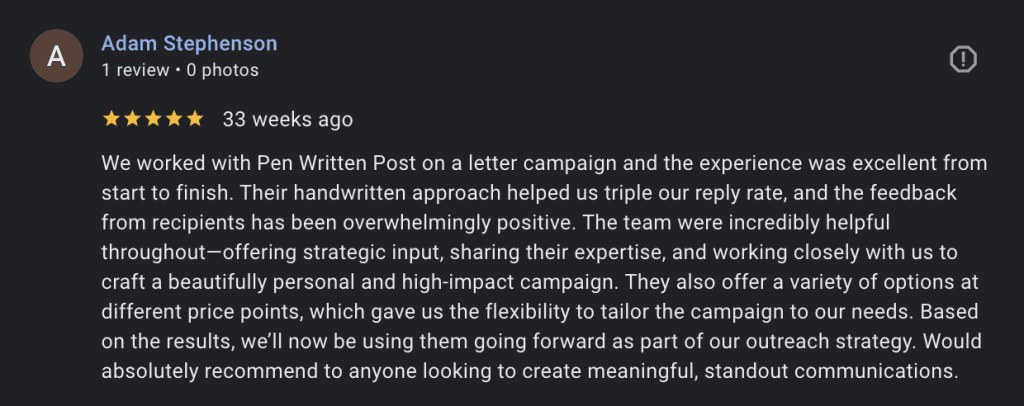 We worked with Pen Written Post on a letter campaign and the experience was excellent from start to finish. Their handwritten approach helped us triple our reply rate, and the feedback from recipients has been overwhelmingly positive. The team were incredibly helpful throughout—offering strategic input, sharing their expertise, and working closely with us to craft a beautifully personal and high-impact campaign. They also offer a variety of options at different price points, which gave us the flexibility to tailor the campaign to our needs. Based on the results, we’ll now be using them going forward as part of our outreach strategy. Would absolutely recommend to anyone looking to create meaningful, standout communications.