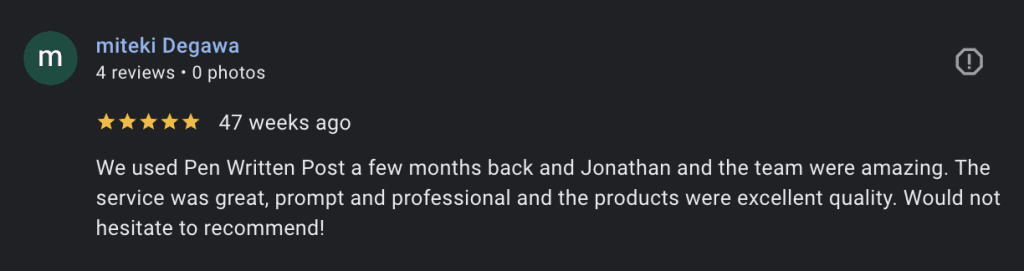 We used Pen Written Post a few months back and Jonathan and the team were amazing. The service was great, prompt and professional and the products were excellent quality. Would not hesitate to recommend!