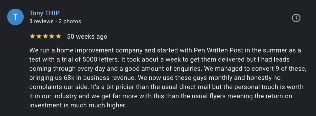 We run a home improvement company and started with Pen Written Post in the summer as a test with a trial of 5000 letters. It took about a week to get them delivered but I had leads coming through every day and a good amount of enquiries. We managed to convert 9 of these, bringing us 68k in business revenue. We now use these guys monthly and honestly no complaints our side. It’s a bit pricier than the usual direct mail but the personal touch is worth it in our industry and we get far more with this than the usual flyers meaning the return on investment is much much higher.
