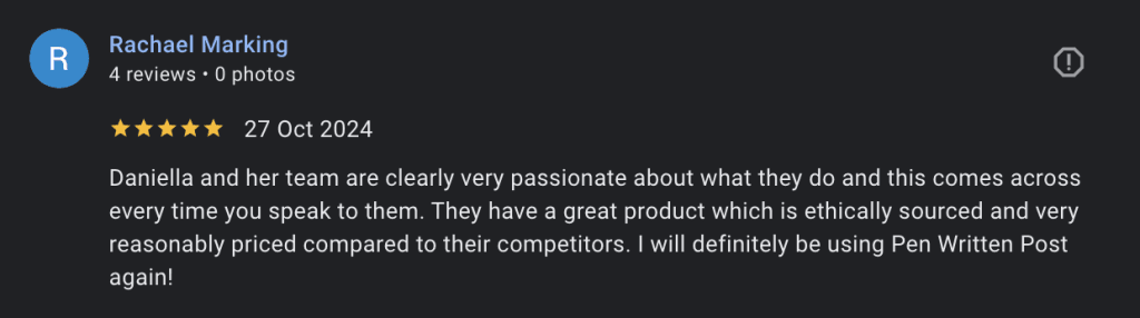 Daniella and her team are clearly very passionate about what they do and this comes across every time you speak to them. They have a great product which is ethically sourced and very reasonably priced compared to their competitors. I will definitely be using Pen Written Post again!